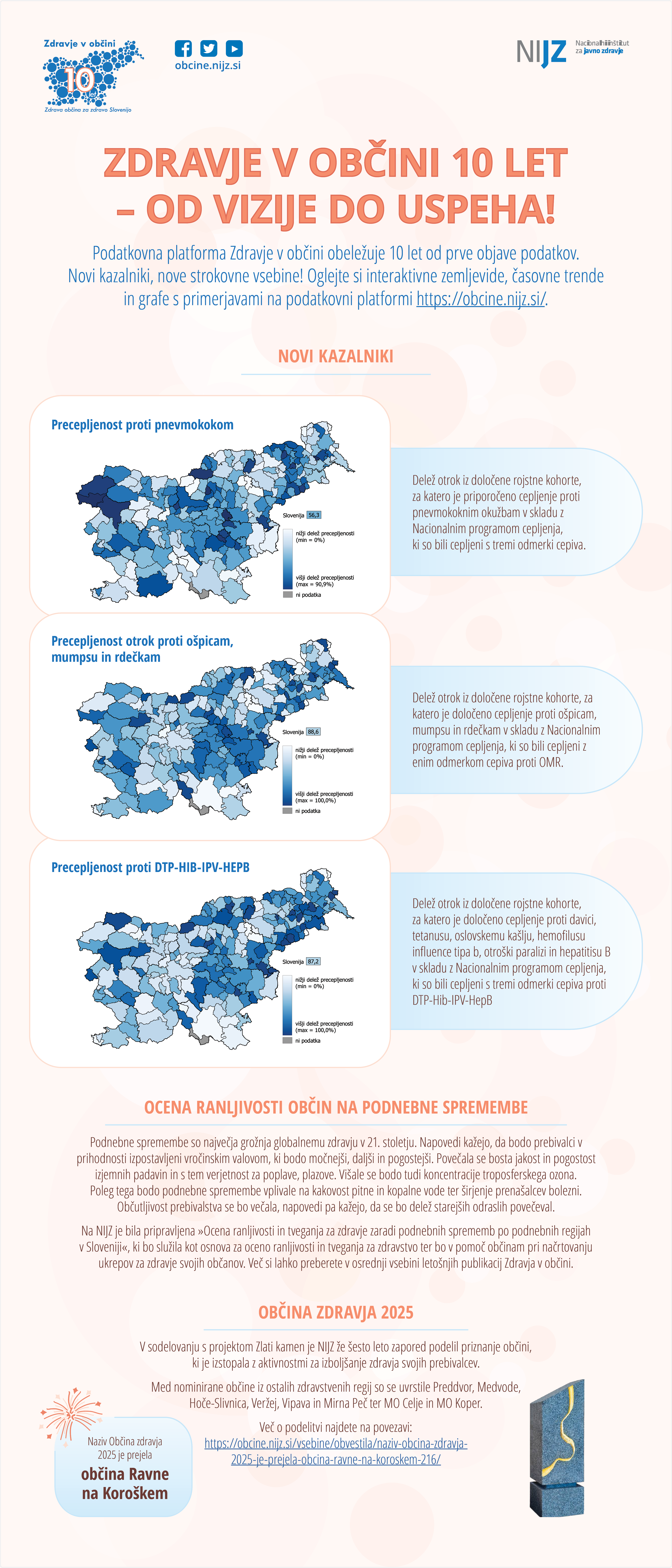 V sredini letošnjih publikacij izpostavljamo tveganje za zdravje po podnebnih regijah Slovenije. Podnebne spremembe so največja grožnja globalnemu zdravju v 21. stoletju. Napovedi kažejo, da bodo prebivalci v prihodnosti izpostavljeni vročinskim valovom, ki bodo močnejši, daljši in pogostejši. Povečala se bosta jakost in pogostost izjemnih padavin in s tem verjetnost za poplave, plazove. Višale se bodo tudi koncentracije troposferskega ozona. Poleg tega bodo podnebne spremembe vplivale na kakovost pitne in kopalne vode ter širjenje prenašalcev bolezni. Občutljivost prebivalstva se bo večala, kar je povezano z večjim deležem starejših prebivalcev. Na NIJZ je bila pripravljena »Ocena ranljivosti in tveganja za zdravje zaradi podnebnih sprememb po podnebnih regijah v Sloveniji«, ki bo služila kot osnova za oceno ranljivosti in tveganja za zdravstvo ter bo v pomoč občinam pri načrtovanju ukrepov za zdravje svojih občanov. Več si lahko preberete v osrednji vsebini letošnjih publikacij Zdravja v občini.